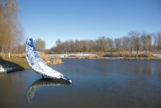 在通州區(qū)城市綠心森林公園的水系中,也有一件為冬奧會新創(chuàng)作的公共藝術(shù)作品《舟》。它看起來如同一葉代表“同舟共濟”的輕舟,也像一根羽毛、一片象征著和平與友誼的橄欖葉。走近仔細(xì)看,雕塑由許多鵝卵石般的陶瓷顆粒組成。它由中國藝術(shù)研究院雕塑家張冕、郅敏合作,是北京冬奧會公共藝術(shù)作品征集活動評選出的最佳作品之一。
