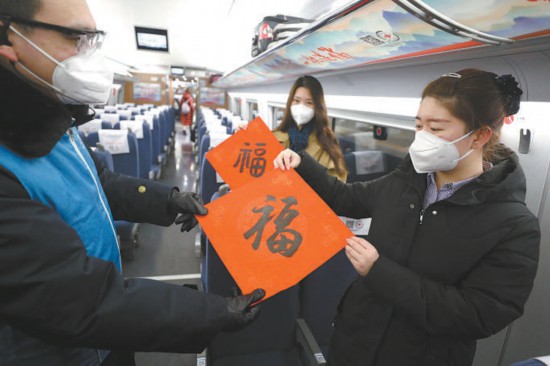 昨天5時34分,北京地區(qū)首趟春運(yùn)高鐵G6737次列車發(fā)車,列車員將精心準(zhǔn)備的福字送給旅客。本報記者 安旭東攝