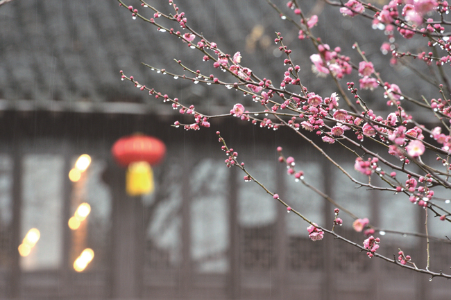 1月23日下午,嘉興市區(qū)梅灣街,冬雨中幾株紅梅迎春開放,競(jìng)相爭(zhēng)艷。(徐志達(dá))