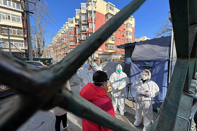 1月25日早8點,室外氣溫低于零度,而今日的大風(fēng)天氣更降低了體感溫度。在小區(qū)門口,街道和社區(qū)的“大白”們早已就位,在管控區(qū)外值守并隨時準(zhǔn)備為身體不便的居民進行入戶核酸檢測工作。
