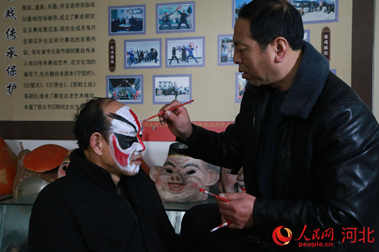 涉縣賽戲代表性傳承人湯香平給演員化妝。 李獻(xiàn)海攝