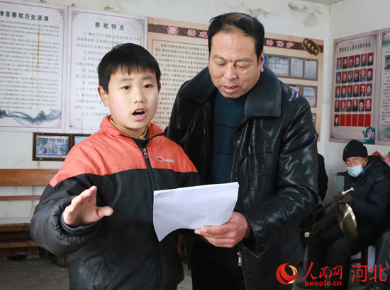 涉縣賽戲代表性傳承人教小徒弟表演賽戲。 李獻(xiàn)海攝