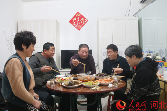 李軍與趙鳳潮、王會(huì)平等人在一起吃團(tuán)圓飯。裴信民攝