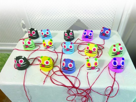 記者看到,吳為民的老伴王培珍拎起兩只系著紅繩的“皮老虎”,熟練地倒置在顏料桶中,等到其身體全部浸沒,立刻拿出,迅速掛在旁邊細長的竹竿上,三四天之后,方能上畫。只見王培珍在模型上用自制毛筆畫了起來,不一會兒,“皮老虎”胡須就出來了,最后用紅、白顏料分別點出“皮老虎”的眼白、眼珠和耳朵,一只活靈活現的老虎就畫成了。