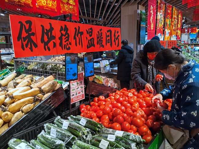 在超市發(fā)雙榆樹店,蔬菜售賣臺上“保供穩(wěn)價 溫暖同行”的標(biāo)語十分顯眼。據(jù)了解,春節(jié)前夕,為穩(wěn)定北京市場,讓市民在春節(jié)期間買到安全便宜的商品,北京市向各大連鎖超市發(fā)出倡議,堅持10種蔬菜價格“兩不漲”,即日環(huán)比不漲價、農(nóng)歷同比不漲價(價格不高于農(nóng)歷同期)。
