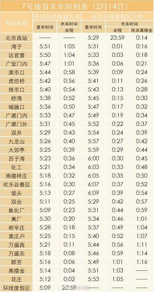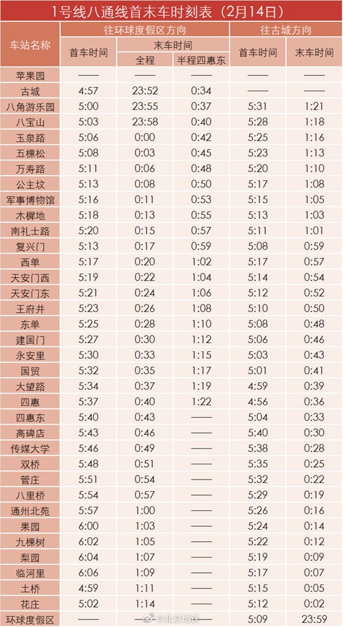 2月14日晚北京地鐵1號線八通線、2號線、7號線延長運(yùn)營時間