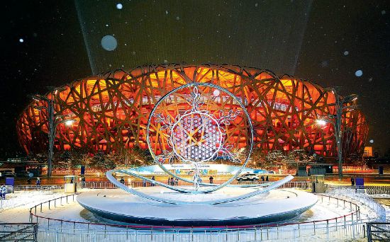 雪夜,北京賽區(qū)頒獎(jiǎng)廣場(chǎng)“雪花”火炬展示臺(tái)與鳥巢交相輝映。 本報(bào)記者 方非攝