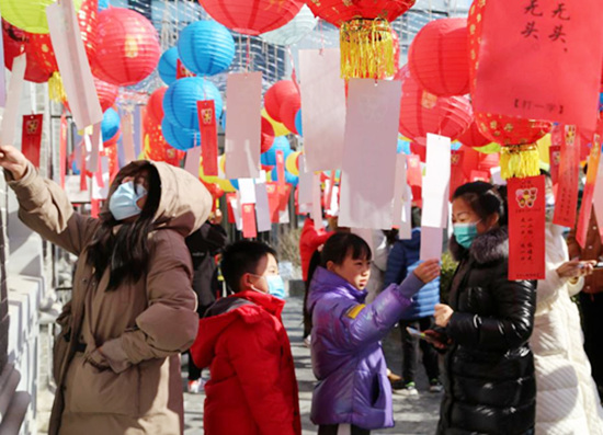 在百年建筑九如樓前的花燈廣場(chǎng),200件掛有傳統(tǒng)燈謎的彩色宣紙燈籠與北京雪后藍(lán)天相映成趣,全天開(kāi)放燈謎游戲供民眾互動(dòng)參與。