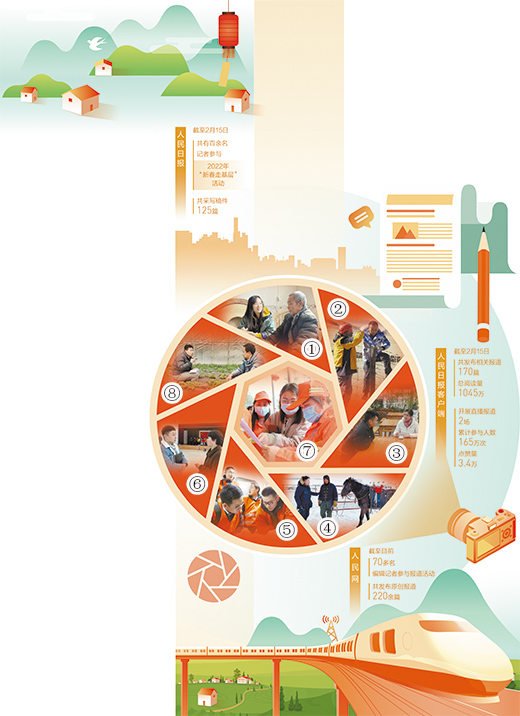圖①至圖⑧依次為本報重慶分社記者常碧羅(左)、青海分社記者賈豐豐(右)、湖南分社記者王云娜(右)、內蒙古分社記者吳勇(左)、福建分社記者劉曉宇(左)、浙江分社記者竇瀚洋(左)、廣西分社記者祝佳祺(中)及人民網記者馮亞濤(左)在春節(jié)期間深入基層采訪。