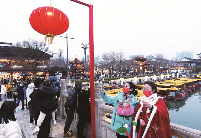 昨日,南京夫子廟不舉辦線下燈會(huì),嚴(yán)格實(shí)行“雙碼準(zhǔn)入”,游客分兩次掃描“預(yù)約碼”和“蘇康碼”有序進(jìn)入。 本報(bào)記者 吳俊 攝