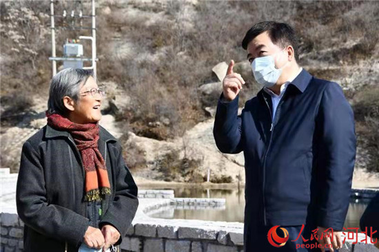 黨曉龍與鄧小嵐在保定阜平鐵貫山腳下暢談基礎教育。 人民網 張繼航攝