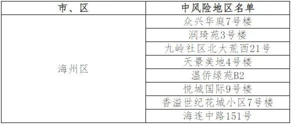 通告稱(chēng),根據(jù)國(guó)務(wù)院聯(lián)防聯(lián)控機(jī)制有關(guān)規(guī)定,經(jīng)綜合評(píng)估研判,市指揮部決定,自2022年3月6日0時(shí)起,將眾興華庭7號(hào)樓、潤(rùn)琦苑3號(hào)樓、九嶺社區(qū)北大荒西21號(hào)、天景美地4號(hào)樓、溫僑綠苑B2、悅城國(guó)際9號(hào)樓、香溢世紀(jì)花城小區(qū)7號(hào)樓、海連中路151號(hào)調(diào)整為中風(fēng)險(xiǎn)地區(qū),其他地區(qū)風(fēng)險(xiǎn)等級(jí)不變。