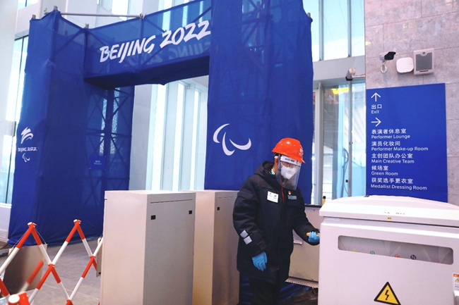 國(guó)網(wǎng)北京頒獎(jiǎng)廣場(chǎng)電力保障團(tuán)隊(duì)成員在延慶冬殘奧頒獎(jiǎng)廣場(chǎng)巡視舞臺(tái)區(qū)設(shè)備,確保頒獎(jiǎng)儀式供電可靠。張博寧攝