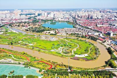 2021年10月12日拍攝的滄州市百獅園生態(tài)修復(fù)區(qū)。滄州市百獅園生態(tài)修復(fù)區(qū)原是大運(yùn)河沿線的兩個(gè)城中村,目前已成為城市內(nèi)一道靚麗的風(fēng)景線。(資料片)新華社發(fā)