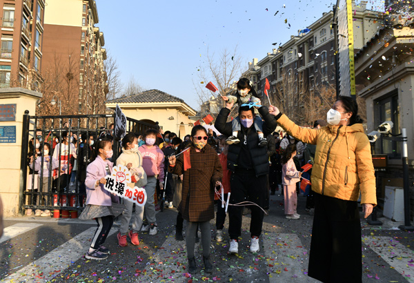 在潤澤悅溪小區(qū)門口,工作人員快速拆除快遞架,小區(qū)大門緩緩打開,居民們興高采烈地結(jié)伴走出小區(qū)。社區(qū)黨委書記、居委會主任分別向志愿者代表頒發(fā)證書并送上鮮花,向入駐社工、民警、機(jī)關(guān)工作人員獻(xiàn)上鮮花,為社區(qū)衛(wèi)生服務(wù)中心和來廣營派出所送錦旗,為愛心企業(yè)頒發(fā)獎牌。居民代表向社區(qū)黨委及小區(qū)物業(yè)送錦旗。3月8日也是國際婦女節(jié),地區(qū)特意制作了電子賀卡,為每位女性同胞送上節(jié)日祝福。