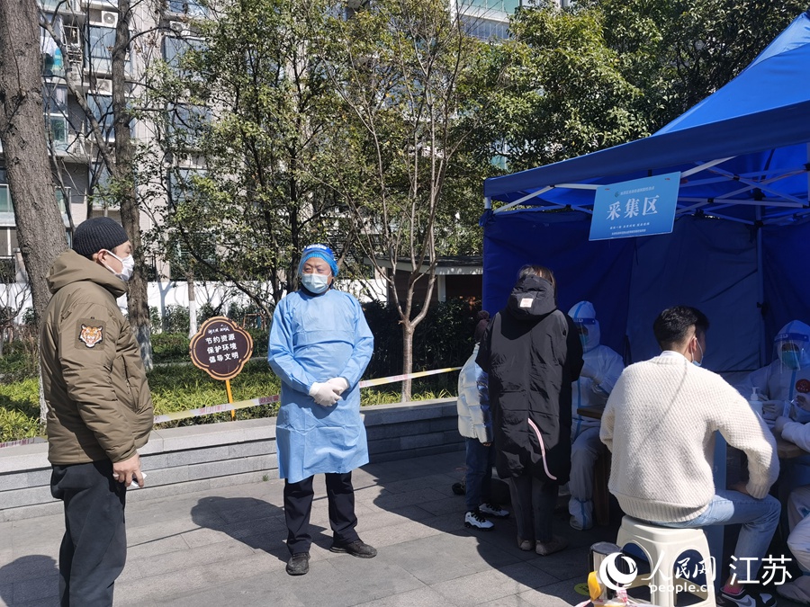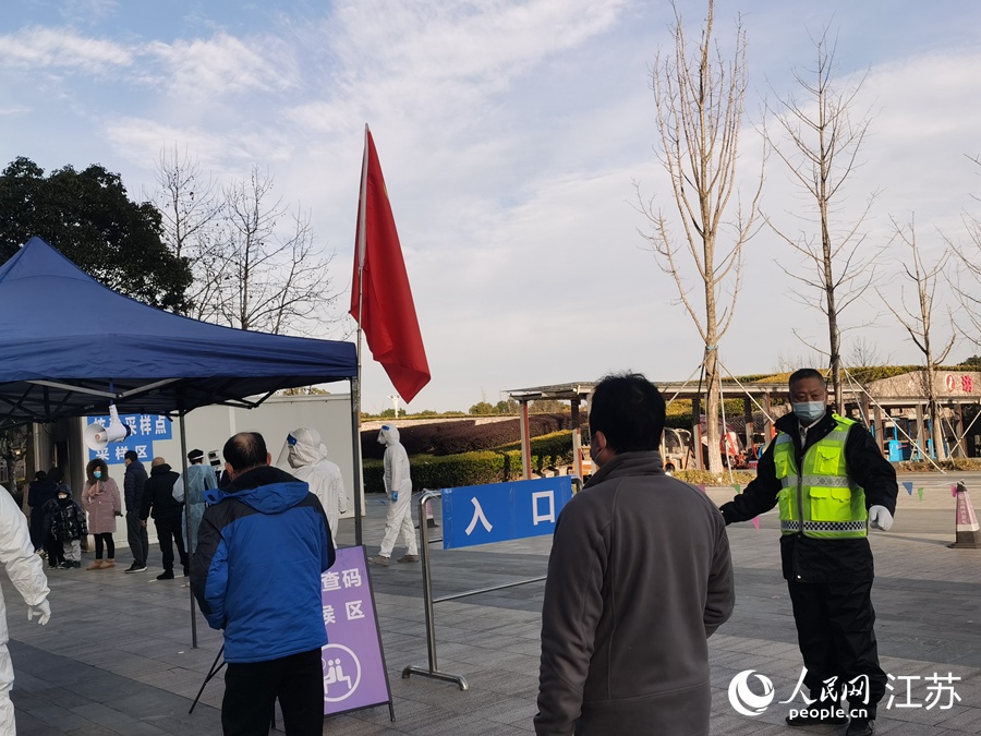 2月24日上午,在姑蘇區(qū)三香公園內(nèi),王新(中)在核酸檢測采樣點(diǎn)維持秩序。人民網(wǎng)記者 王繼亮攝