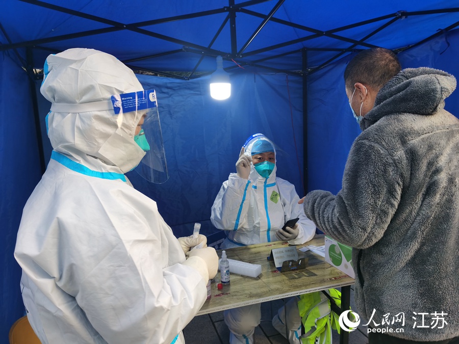 2月27日一早6點(diǎn)多,在吳江區(qū)松陵街道水秀社區(qū),王新(中)為前來采樣的市民登錄個(gè)人信息。人民網(wǎng)記者 王繼亮攝