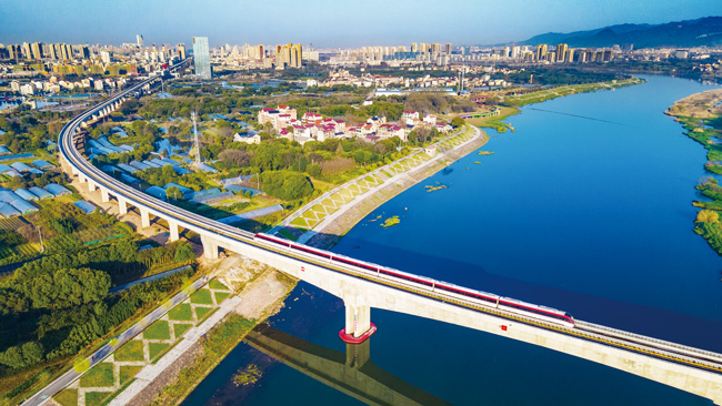 3月12日早晨,金華金義東市域軌道交通一列電客車疾馳而過,穿過金東區(qū)跨東陽江大橋,駛向下一站——金華南站,河道兩岸,綠油油的田野、遠處林立的高樓連片交織,組成一幅春天絢麗多彩的圖畫。(時寬兵)