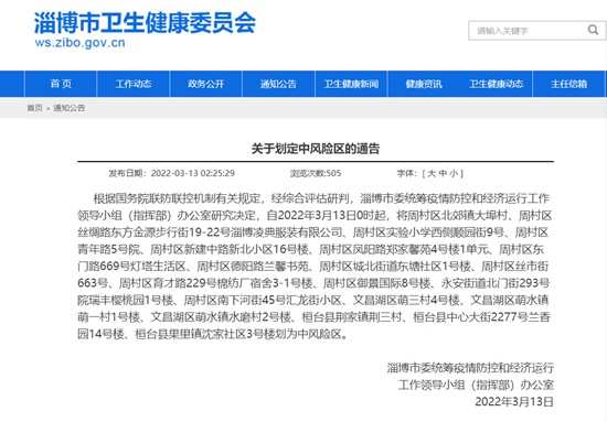 人民網(wǎng)淄博3月13日電(鄭浦麗)據(jù)淄博市衛(wèi)生健康委員會(huì)官網(wǎng)消息,根據(jù)國(guó)務(wù)院聯(lián)防聯(lián)控機(jī)制有關(guān)規(guī)定,經(jīng)綜合評(píng)估研判,淄博市委統(tǒng)籌疫情防控和經(jīng)濟(jì)運(yùn)行工作領(lǐng)導(dǎo)小組(指揮部)辦公室研究決定,自2022年3月13日0時(shí)起,將周村區(qū)北郊鎮(zhèn)大埠村、周村區(qū)絲綢路東方金源步行街19-22號(hào)淄博凌典服裝有限公司、周村區(qū)實(shí)驗(yàn)小學(xué)西側(cè)順園街9號(hào)、周村區(qū)青年路5號(hào)院、周村區(qū)新建中路新北小區(qū)16號(hào)樓、周村區(qū)鳳陽(yáng)路鄭家馨苑4號(hào)樓1單元、周村區(qū)東門(mén)路669號(hào)燈塔生活區(qū)、周村區(qū)德陽(yáng)路蘭馨書(shū)苑、周村區(qū)城北街道東塘社區(qū)1號(hào)樓、周村區(qū)絲市街663號(hào)、周村區(qū)育才路229號(hào)棉紡廠宿舍3-1號(hào)樓、周村區(qū)御景國(guó)際8號(hào)樓、永安街道北門(mén)街293號(hào)院瑞豐櫻桃園1號(hào)樓、周村區(qū)南下河街45號(hào)匯龍街小區(qū)、文昌湖區(qū)萌三村4號(hào)樓、文昌湖區(qū)萌水鎮(zhèn)萌一村1號(hào)樓、文昌湖區(qū)萌水鎮(zhèn)水磨村2號(hào)樓、桓臺(tái)縣荊家鎮(zhèn)荊三村、桓臺(tái)縣中心大街2277號(hào)蘭香園14號(hào)樓、桓臺(tái)縣果里鎮(zhèn)沈家社區(qū)3號(hào)樓劃為中風(fēng)險(xiǎn)區(qū)。
