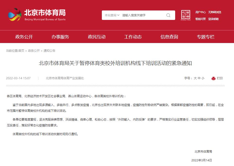 北京:全市范圍內(nèi)暫停體育類校外機(jī)構(gòu)的線下培訓(xùn)活動(dòng)