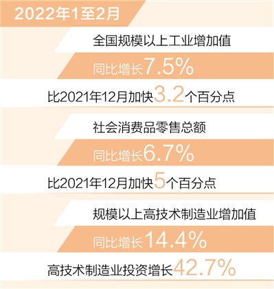 工業(yè)、服務(wù)業(yè)逐步回升。1至2月,全國規(guī)模以上工業(yè)增加值同比增長7.5%,比2021年12月加快3.2個(gè)百分點(diǎn),41個(gè)大類行業(yè)中超過九成行業(yè)實(shí)現(xiàn)增長;全國服務(wù)業(yè)生產(chǎn)指數(shù)同比增長4.2%,比2021年12月加快1.2個(gè)百分點(diǎn)。