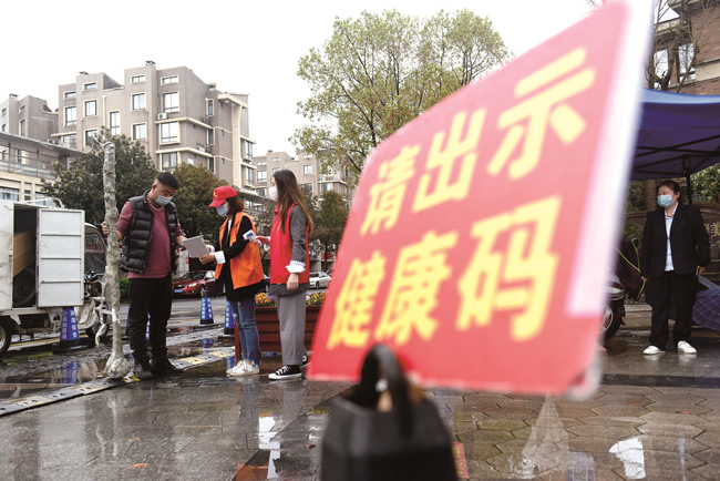 3月17日,在嘉興秀洲區(qū)一家小區(qū)門口,工作人員身著紅馬甲和同伴冒雨堅守在小區(qū)門口,開展替崗輪值,協(xié)助社區(qū)干部對進(jìn)入小區(qū)的人員逐一驗碼測溫,筑牢疫情防控安全線。(馮玉坤)