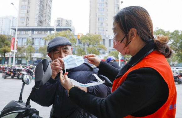 志愿者在街頭為群眾免費(fèi)發(fā)放口罩,宣傳防疫知識(shí)。張莉琳攝
