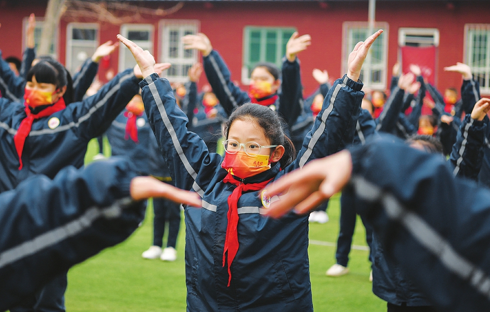 3月24日,臨汾市興國實(shí)驗(yàn)小學(xué),師生們?cè)谡n間跳律動(dòng)減壓操。連日來,該校結(jié)合閉環(huán)管理,為全校師生量身編排了律動(dòng)減壓操和手舞操,使學(xué)生快樂學(xué)習(xí)、健康生活。(閆銳鵬攝)