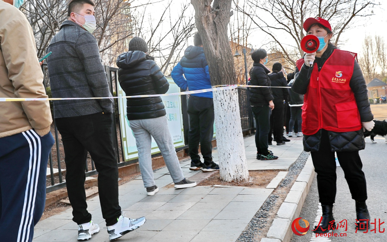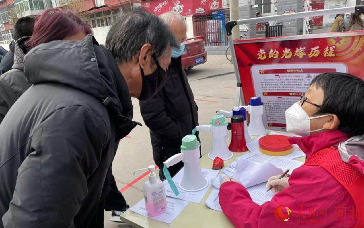在河北省秦皇島市海港區(qū)白塔嶺街道森林逸城社區(qū)內(nèi),黨員志愿者正在維持現(xiàn)場(chǎng)秩序。 曹建雄攝