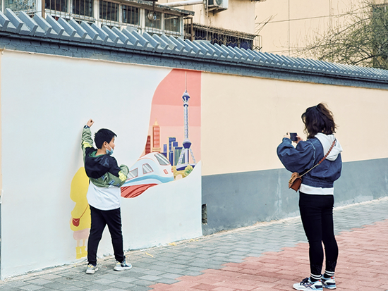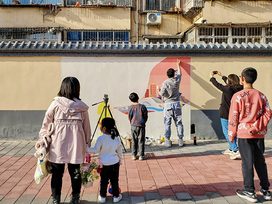 四歲的熱心市民“可樂(lè)”看著正在進(jìn)行墻體繪畫的工作人員贊嘆道,“可樂(lè)”的媽媽在旁邊開(kāi)心地笑著。