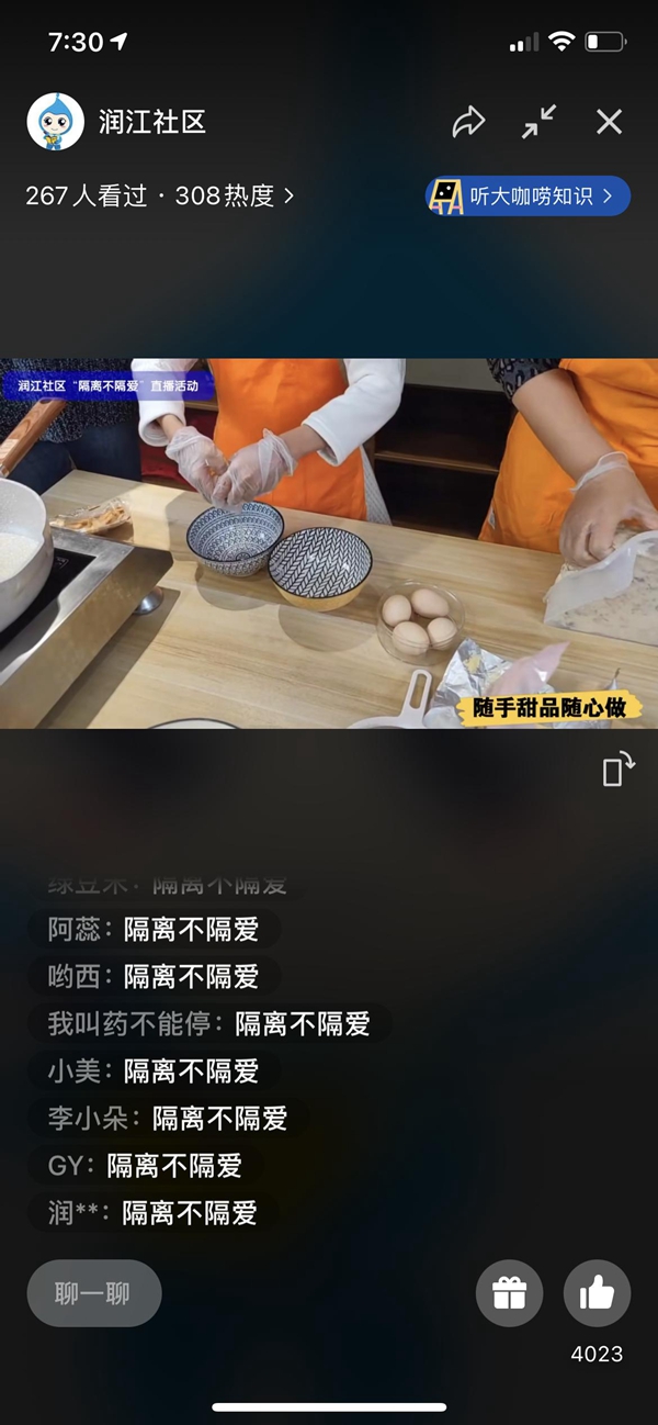 在這個特殊的“戰(zhàn)疫”時刻,潤江社區(qū)依舊在3月29日-4月3日6天時間里陸續(xù)推出了包括心理疏導課程、健身指導課程、烘焙分享、家庭收納、親子共讀和感悟分享在內(nèi)的直播內(nèi)容。截至目前,“小杜直播間”已經(jīng)吸引了社區(qū)內(nèi)近1500人次觀看,這些直播內(nèi)容貼合了社區(qū)居民的需求,從各方面為居民緩解居家的焦慮、豐富居民的居家生活。