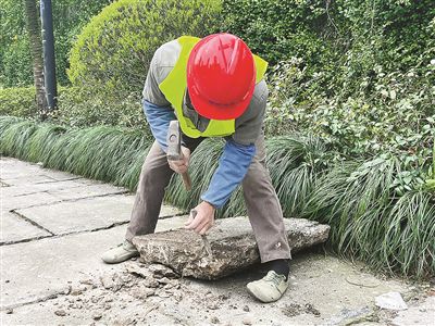 “我們秉持‘最小干預(yù)’的原則——結(jié)構(gòu)層穩(wěn)定的老石板,原則上不修;需要修繕的老石板,則嚴(yán)格遵守‘修舊如舊、保留肌理’的原則?!焙贾輬@林設(shè)計(jì)院股份有限公司相關(guān)負(fù)責(zé)人介紹,“一般兩種情況下才進(jìn)行修復(fù),一是樹(shù)池周邊起拱、松動(dòng)嚴(yán)重,二是老石板破損、松動(dòng)嚴(yán)重。”