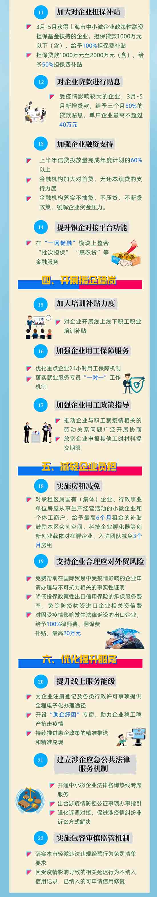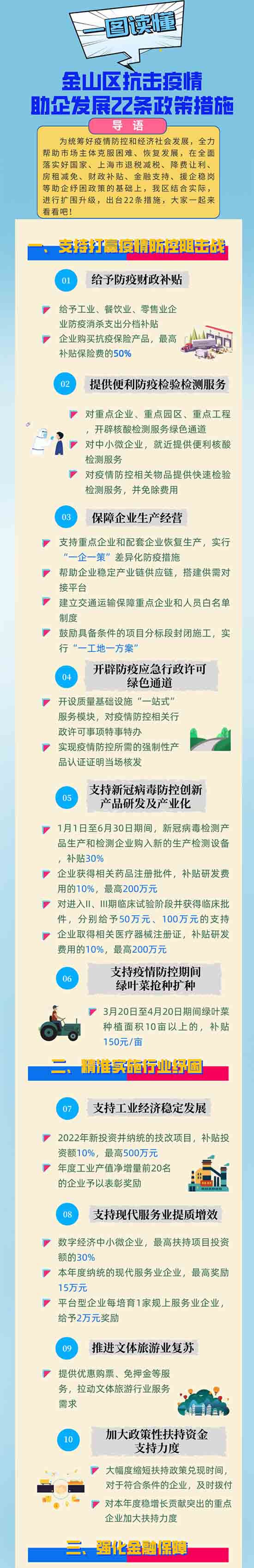 據(jù)悉,為統(tǒng)籌好疫情防控和經(jīng)濟社會發(fā)展,全力幫助市場主體克服困難、恢復(fù)發(fā)展,在全面落實好國家、上海市退稅減稅、降費讓利、房租減免、財政補貼、金融支持、援企穩(wěn)崗等助企紓困政策的基礎(chǔ)上,結(jié)合金山實際,進(jìn)行擴圍升級,制訂《金山區(qū)抗擊疫情助企發(fā)展22條政策措施》?!?2條”既聚焦企業(yè)當(dāng)前面臨的“難點”“痛點”“堵點”,又考慮到疫情后企業(yè)加快發(fā)展的各項訴求,共計包括六大方面內(nèi)容,即支持打贏疫情防控阻擊戰(zhàn)、精準(zhǔn)實施行業(yè)紓困、強化金融保障、開展援企穩(wěn)崗、減輕企業(yè)負(fù)擔(dān)及優(yōu)化提升服務(wù),用實實在在的舉措,精準(zhǔn)幫助市場主體紓困解難,穩(wěn)定經(jīng)濟增長。