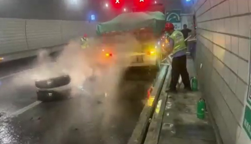 22點(diǎn)3分,巡查員通過對(duì)向隧道的汽通門第一時(shí)間進(jìn)入現(xiàn)場(chǎng),施救人員從同向到達(dá)現(xiàn)場(chǎng),一次“雙向奔赴”的救火就此展開。一名巡查員與施救人員緊密配合,拿出水槍,對(duì)著起火點(diǎn)進(jìn)行滅火。不出2分鐘,起火點(diǎn)的明火被熄滅,但是溫度還是很高,需要不斷澆水才能阻止輪胎復(fù)燃。另一名巡查員則將司機(jī)帶離到安全地帶,隨后又將車道上的雜物清理至緊急停車帶,以便解除卡口后為后續(xù)車輛提供一個(gè)安全的行車環(huán)境。22點(diǎn)23分,車道恢復(fù)暢通。