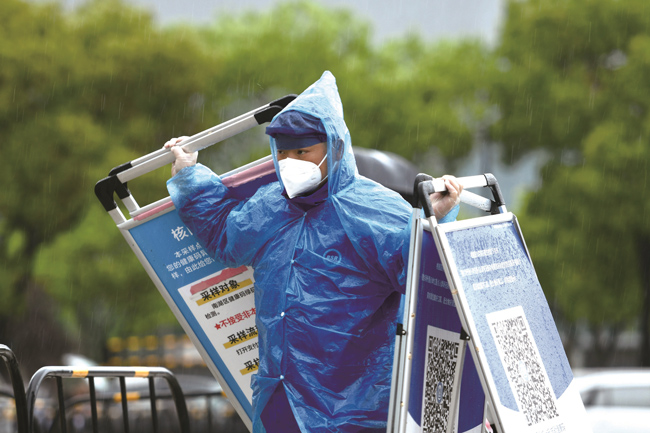4月13日,在嘉興市區(qū)三元路上的新嘉街道核酸采樣點(diǎn),來自嘉興藍(lán)天救援隊(duì)的志愿者們在大雨中堅(jiān)守,協(xié)助完成核酸采樣。(王振宇)