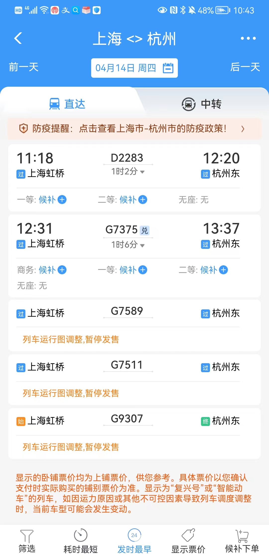以查詢4月14日上海-杭州的火車票為例,僅剩的5趟列車中,D2283、G7375只是從上海虹橋站經(jīng)過(guò),車票售罄是因?yàn)橘I票的幾乎都是別的城市上車的旅客,實(shí)際從虹橋站上車的旅客幾乎沒(méi)有;另外兩趟在上海虹橋站的過(guò)路車(G7589、G7511)和一趟始發(fā)車(G9307)干脆已暫停發(fā)售車票,更不存在大量上海出發(fā)旅客買票的可能。