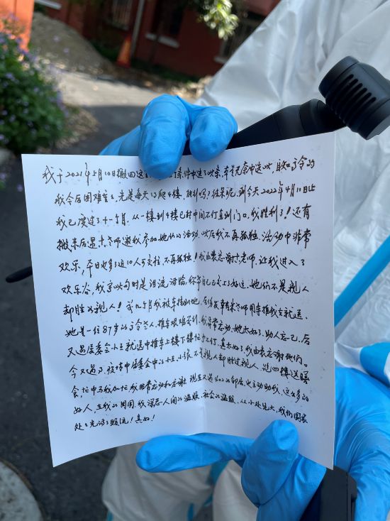 幾經(jīng)推辭,錢留在老人家手里,但她還執(zhí)拗地遞來兩封信,一封短的,本來包鈔票用的:這是給您們和廣大志愿者添些營養(yǎng)品用,望勿拒。還有封長信里提到,“疫情中,居委會的小王、小張,不是親人卻勝過親人,跑四樓送膳食,我非常感謝。”