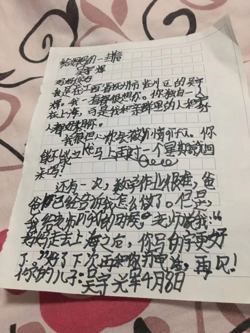“收到回信后,孩子半天沒吱聲,看著看著眼眶就紅起來了。”吳宇輝的奶奶說,他媽媽不在家的這段時間,懂事了好多。