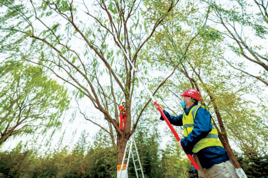 通州大運(yùn)河森林公園里,園林養(yǎng)護(hù)人員用高枝鋸修剪細(xì)枝。本報(bào)記者 潘之望攝