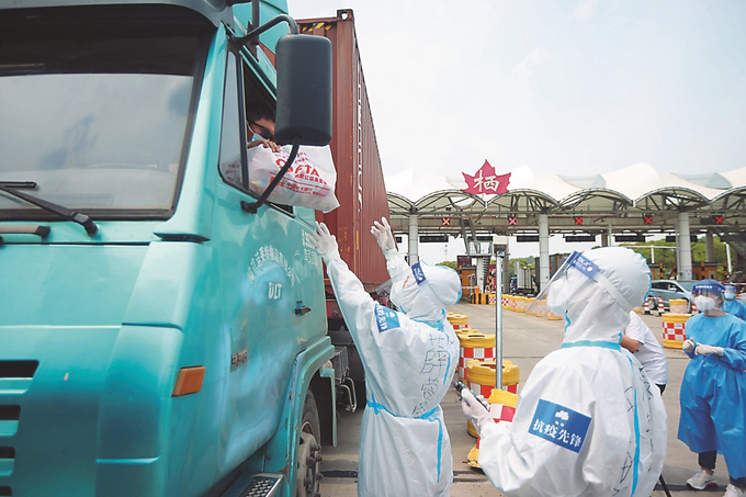 以“同心抗疫 我們在行動”為主題的貨車司機(jī)關(guān)愛活動最近在我省多地開展,志愿者們?yōu)樨涇囁緳C(jī)送去“抗疫愛心包”,提供暖心服務(wù)。圖為20日,在南京繞城高速棲霞收費(fèi)站出口,志愿者向貨車司機(jī)送上“抗疫愛心包”。本報記者 陳儼 攝