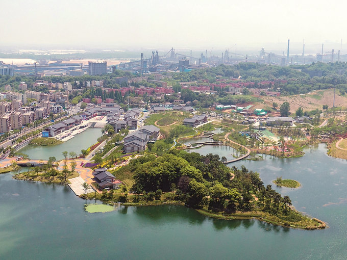 自二〇二一年起,南京啟動幸福河湖建設行動,截至目前,十七條幸福河湖已經(jīng)建成。圖為昨日航拍的南京桃湖公園。 本報記者 陳儼 攝