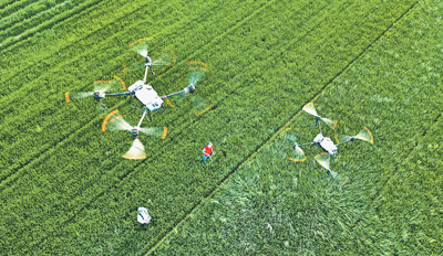 河南省尉氏縣植保隊(duì)員在麥田進(jìn)行“一噴三防”作業(yè),與傳統(tǒng)方式相比,無(wú)人機(jī)噴灑可減少農(nóng)藥使用量。