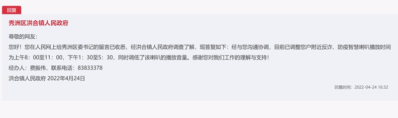 秀洲區(qū)洪合鎮(zhèn)人民政府對(duì)此高度重視,并于4月24日進(jìn)行了回應(yīng),并回復(fù)稱,經(jīng)洪合鎮(zhèn)人民政府調(diào)查了解,已與徐女士進(jìn)行了溝通協(xié)調(diào),目前已將徐女士所住小區(qū)附近的反詐、防疫智慧喇叭的播放時(shí)間調(diào)整為上午8:00至11:00,以及下午1:30至5:30,同時(shí)調(diào)低了該喇叭的播放音量。