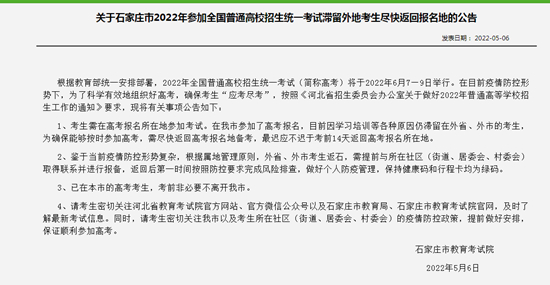 關于石家莊市2022年參加全國普通高校招生統(tǒng)一考試滯留外地考生盡快返回報名地的公告