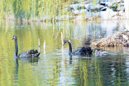 3月29日,圓明園九州景區(qū)后湖里,一對黑天鵝寶寶成功孵化,兩只小天鵝立即成為圓明園新寵,吸引了眾多攝影愛好者前來拍攝。黑天鵝一家在湖中時而靜靜游動,時而將頭扎進水中覓食,映襯著一湖碧水和如煙的拂柳,構(gòu)成一幅絕美的自然畫面。湖邊還有一只黑天鵝正在孵蛋育雛,周邊放置的警戒線幫助黑天鵝安全育雛。游客們也只是遠遠地靜靜地看看,生怕驚擾了這“一家人”。