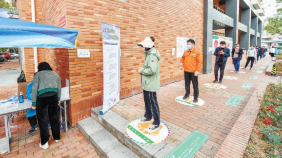 本報(bào)訊(記者 李瑤)昨天,東城區(qū)東四街道在轄區(qū)內(nèi)5個(gè)常態(tài)化核酸檢測(cè)點(diǎn)推出新式“兩米線”,通過充滿童趣的“呼啦圈”地貼,引導(dǎo)居民有序排隊(duì),保持安全距離。“呼啦圈”直徑大約80厘米,中間黃色腳印圖案十分醒目,旁邊還印有疫情防控科普貼,居民站在圈內(nèi)有序排隊(duì)等待核酸檢測(cè)?!啊粌H富有童趣,使排隊(duì)等候不再那么乏味,還嚴(yán)格規(guī)定了排隊(duì)距離,保證大家的安全?!本用顸c(diǎn)贊說。本報(bào)記者 鄧偉攝