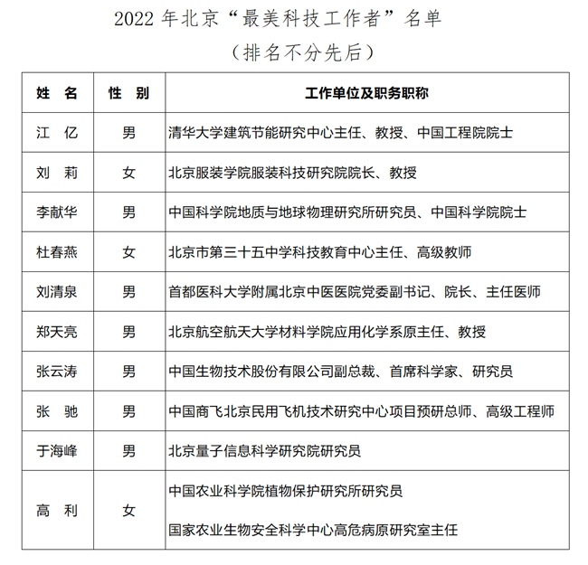 據(jù)了解,2022年北京“最美科技工作者”來自理、工、農、醫(yī)等各學科,涉及工程、材料、生物、航空、教育、醫(yī)療等各領域。其中,既有面向國家重大需求和世界科技前沿,我國建筑節(jié)能、暖通空調制冷的引領者清華大學江億院士,長期從事地球化學理論研究,為嫦娥五號月壤分析做出重要貢獻的中科院地質與地球物理研究所李獻華院士;也有面向人民生命健康,在新冠抗疫一線建立中醫(yī)藥抗疫屏障的首都醫(yī)科大學附屬北京中醫(yī)醫(yī)院劉清泉院長,致力于新冠疫苗等生物制品研發(fā)的中國生物技術股份有限公司首席科學家張云濤;還有面向社會服務和經(jīng)濟主戰(zhàn)場,填補冬季運動競技比賽服研發(fā)空白的北京服裝學院服裝科技研究院劉莉院長,中國農業(yè)科學院植物保護研究所研究員、國家農業(yè)生物安全科學中心高危病原研究室高利主任,全國十佳優(yōu)秀科技輔導員、北京市第三十五中學科技教育中心杜春燕老師……