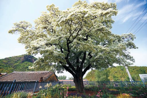 本報訊(記者 王可心)日前,密云區(qū)新城子鎮(zhèn)蘇家峪村一株古流蘇樹進(jìn)入盛花期,作為北京市屈指可數(shù)的古流蘇樹,不僅因花枝觀賞性強(qiáng)受到民眾喜愛,更因其歷史價值而被廣泛關(guān)注。據(jù)了解,流蘇樹系北京市二級保護(hù)野生植物?!拔覀兇暹@株流蘇樹是一級古樹,據(jù)專家推斷,至今已有近600年歷史?!碧K家峪村黨支部書記王銀江介紹,該樹高約13米,主干到1.3米處分為兩主枝,向上延展成蘑菇形樹冠,平均冠幅約16米?;ㄆ陂_滿潔白的流蘇花,遠(yuǎn)觀如覆霜蓋雪,流蘇細(xì)穗隨風(fēng)搖曳,清香怡人。供圖/密云區(qū)委宣傳部