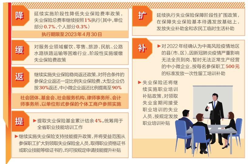 這次失業(yè)保險(xiǎn)新政重點(diǎn)圍繞“降、緩、返、提、擴(kuò)、補(bǔ)”等方面(詳細(xì)內(nèi)容見下圖)推出穩(wěn)崗位提技能防失業(yè)舉措。(記者高建華)