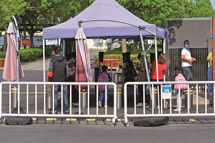 5月16日上午,在嘉興嘉善縣一小學(xué)門口,同學(xué)們佩戴口罩通過(guò)測(cè)溫設(shè)備有序進(jìn)入校園,開啟課堂學(xué)習(xí)。據(jù)了解,除“三區(qū)”外,嘉善縣中小學(xué)、幼兒園均已有序復(fù)學(xué)復(fù)課。(張啟帆)